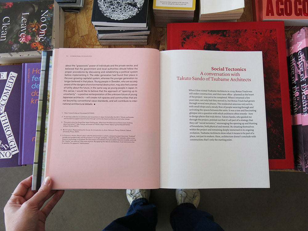 Media coverage of Japanese architecture the past twenty years has largely been dominated by the works of SANAA, Sou Fujimoto, Junya Ishigami, and their contemporaries. Their skillfully designed, ethereal white spaces and structures, have proved well suited to being exported in an increasingly visual culture. Communal Ecologies, on the other hand, highlights an emerging generation of young architects pursuing a very different vision. They strive for an architecture that is rougher, more dynamic, and deeply rooted in social and ecological engagement. With a growing interest in community and network building, and a reevaluation of architecture’s connection to nature, they are developing critical methodologies for practice, and are reimagining the role of the architect in the process.